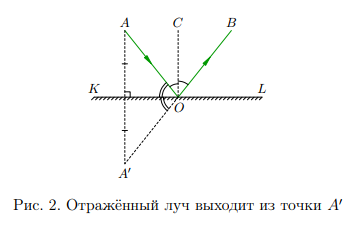 Закон отражения обладает одим простым, однако весьма существенным геометрическим следствием. Давайте посмотрим на рис. 2. Пусть из точки A идет световой луч. Выстроим точку A0 , симметричную точке A относительно отражающей поверхности KL.