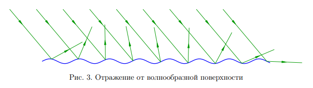 Если поверхность является неровной, то после отражения параллельность лучей нарушится. В качестве примера на рис. 3 представлено отражение с волнообразной поверхности. Отражённые лучи, как видно, проходят в самых различных направлениях.