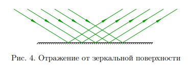 Если же размер неровностей поверхности менее длины световой волны, то такая поверхность именуется зеркальной. При отражении от зеркальной поверхности параллельность пучка сохраняется: кроме того, отражённые лучи идут параллельно (рис. 4).