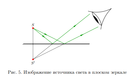 Эта точка служит изображением источника света S. Безусловно, в действительности ничего за зеркалом не светится, никакая энергия там никак не сконцентрирована — это иллюзия, обман зрения, порождение нашего сознания. По этой причине точка S называется мнимым изображением источника S. В точке S пересекаются не сами световые лучи, а их мысленные продолжения «в зазеркалье».