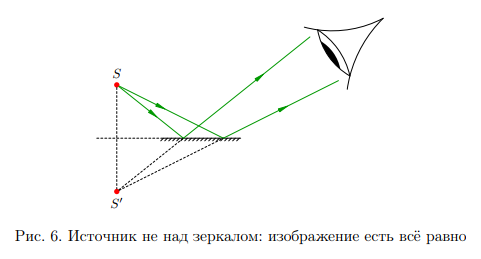 Ясно, то что изображение S’ станет существовать вне зависимости от размеров зеркала и от того, пребывает ли источник непосредственно над зеркалом либо нет (злак. 6). Важно только, чтобы отражённые от зеркала лучи попадали в глаз — а уж глаза сами образует изображение источника.