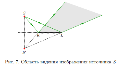От местоположения источника и размеров зеркала находится в зависимости область видения — пространственая область, из которой видно изображение источника. Область видения задаётся краями K и 3 L зеркала KL. Построение области видения изображения S ясно из рис. 7; искомая область видения выделена сероватым фоном.