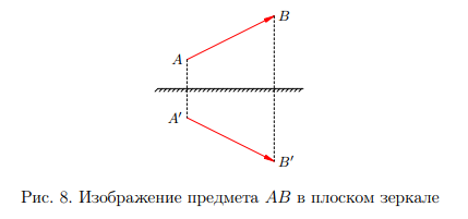 Как построить изображение произвольного объекта в плоском зеркале? Для этого достаточно отыскать изображение каждой точки данного объекта. Однако мы знаем, что изображение точки симметрично самой точке относительно зеркала. Таким образом, изображение предмета в плоском зеркале симметрично предмету относительно плоскости зеркала (рис. 8).