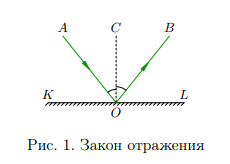 Если световой луч опускается на рубеж области 2-ух сред, совершается отражение света: луч меняет течение собственного хода и возвратится в начальную среду. На рис. 1 представлены падающий луч AO, отражённый луч OB, а также перпендикуляр OC, проведённый к отражающей поверхности KL в точке падения O.